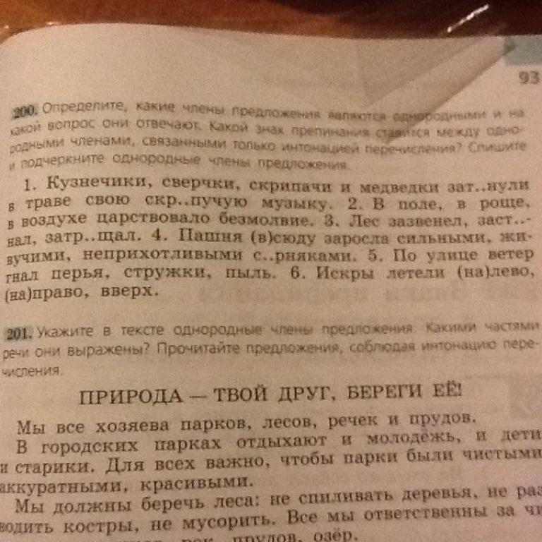В поле, в роще, в воздухе царствовало безмолвие (где? однородные обстоятельства). Лес зазвенел, застонал, затрещал. (что сделал?. однородные сказуемые). Пашня всюду заросла сильными, живучими, неприхотливыми сорняками(какими? однородные определения).По улице ветер гнал перья, стружки, пыль (что? однородные дополнения).Искры летели налево, направо, вверх (куда? однородные обстоятельства)