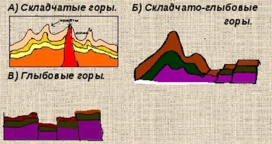 3 Складчатые (Кавказ).Это молодые горы.Они возникли в результате смятия горных пород в складки.