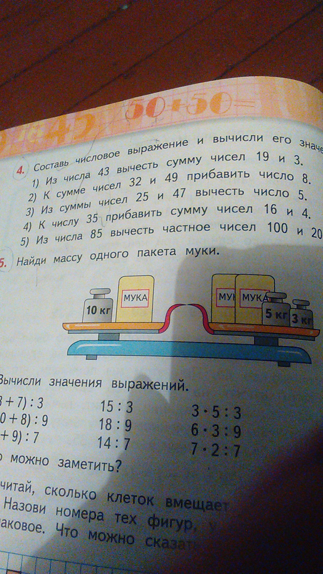 4) 49-19-3=27; 32+49+8=89; 25+47-5=67; 35+16+4=55; 100-85+20=35.