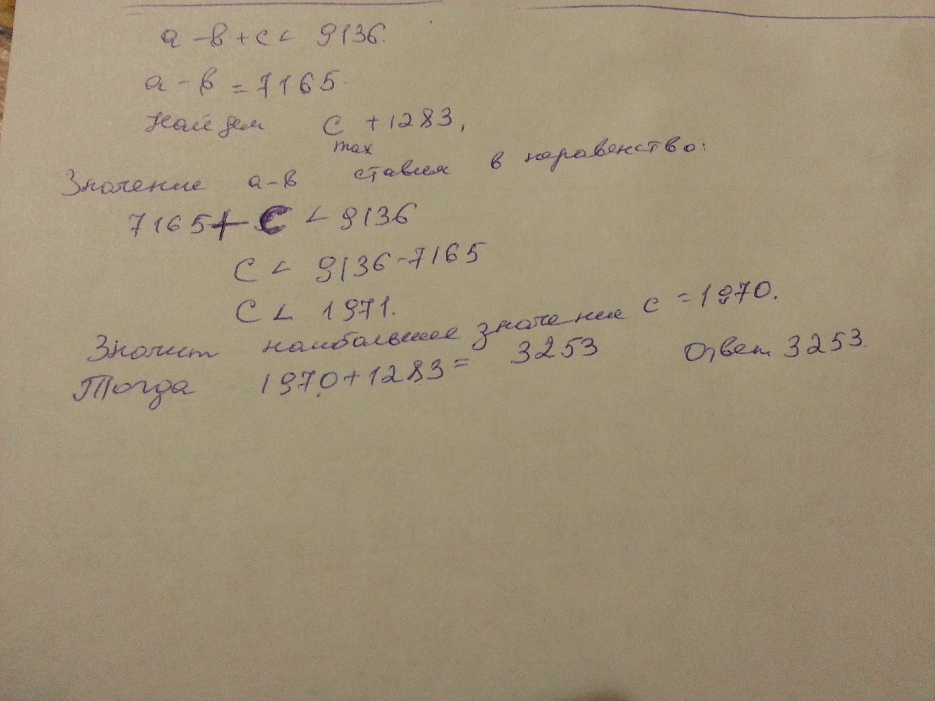 Чему равна сумма числа 1283 и наибольшего значения с из неравенства a-b+c<9136,если a-b=7165? Помогите решать пожалуйста.