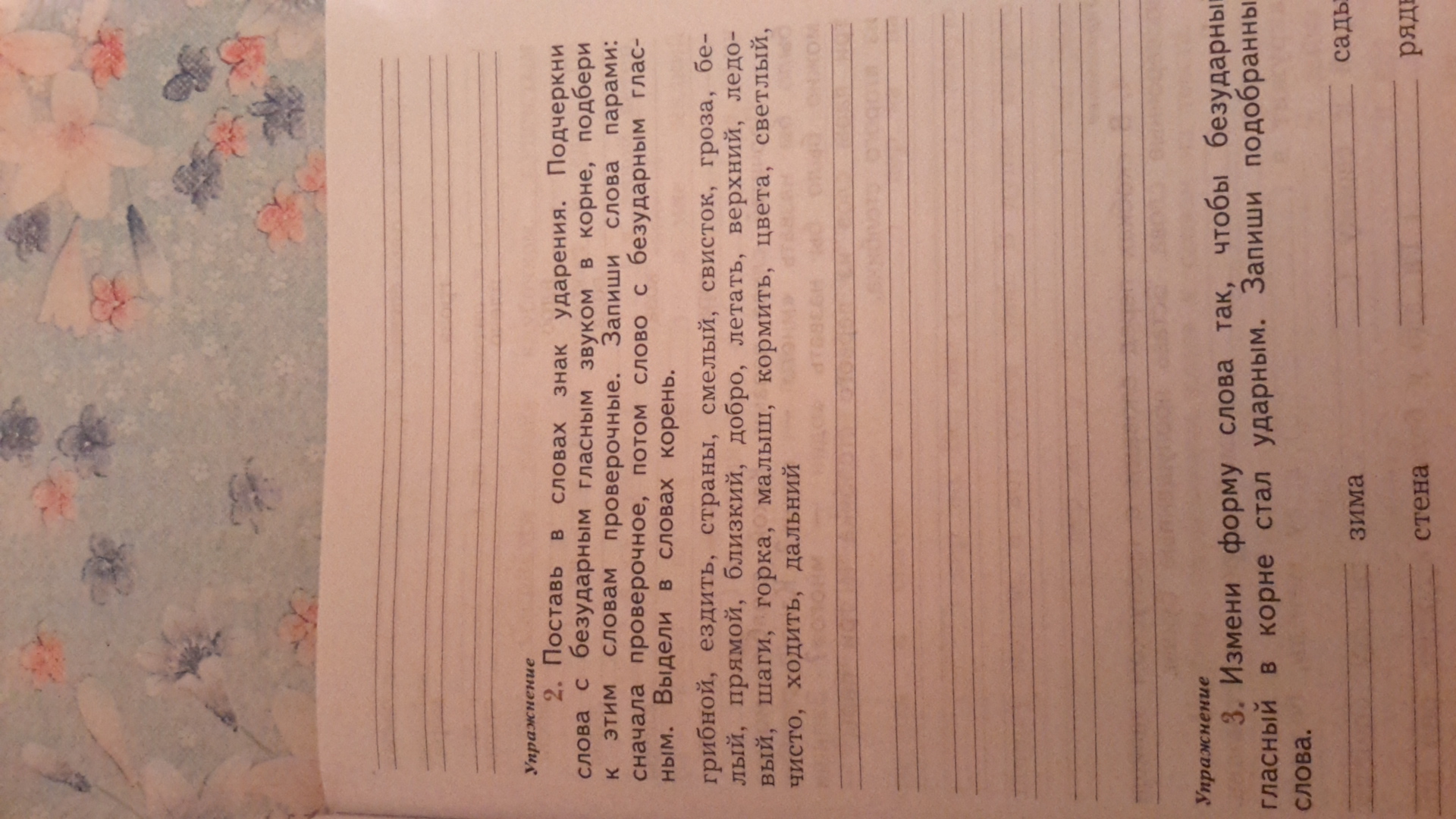 ГрибнОй, Ездить, стрАны, смЕлый, свистОк, грозА, бЕлый, прямОй,блИзкий,добрО, летАть, вЕрхний, ледОвый, шагИ, гОрка, малЫш, кормИть, цветА, свЕтлый, чИсто, ходИть, дАльний. (Корни выделены шрифтом, ударение - заглавными буквами.)