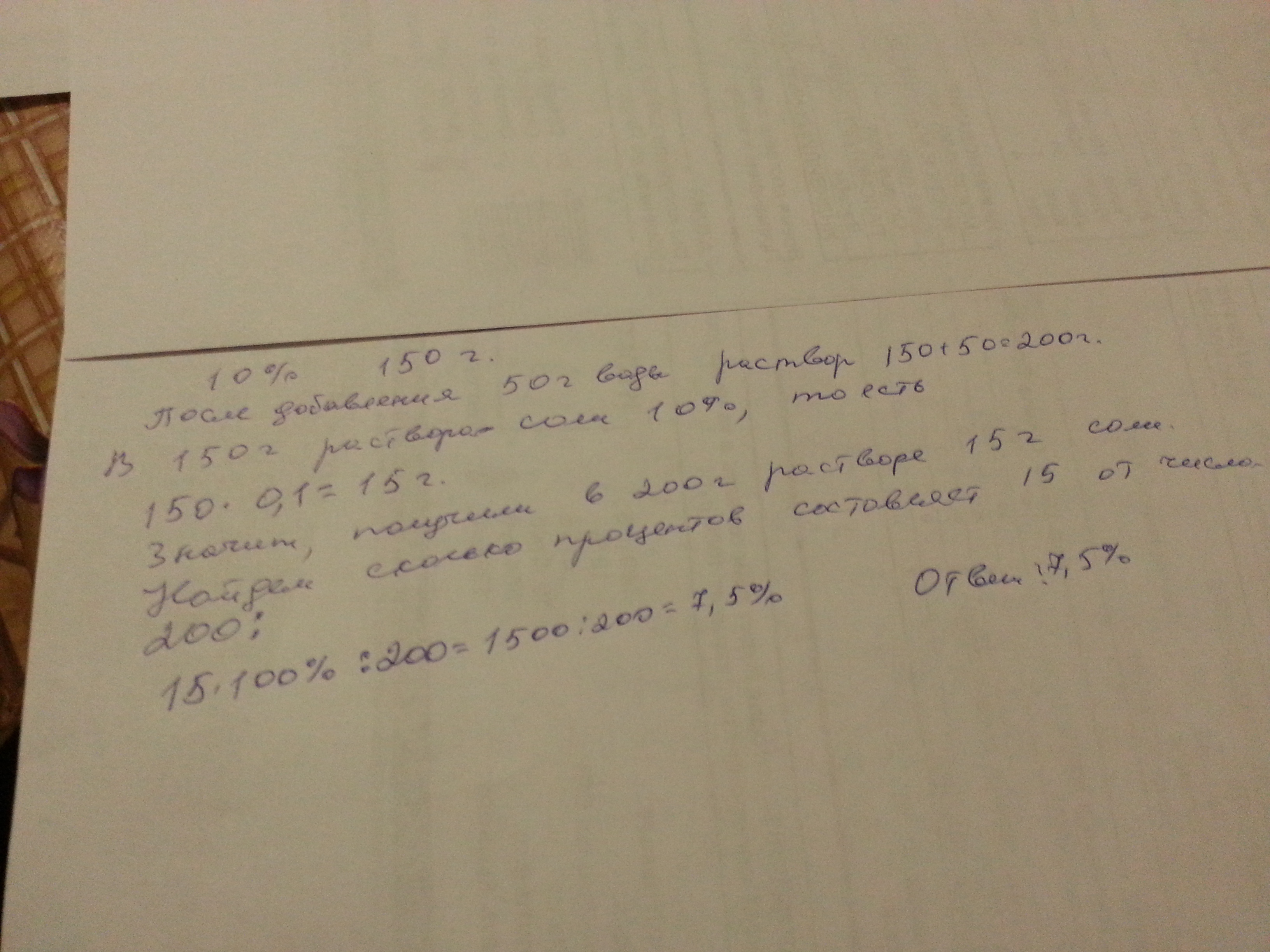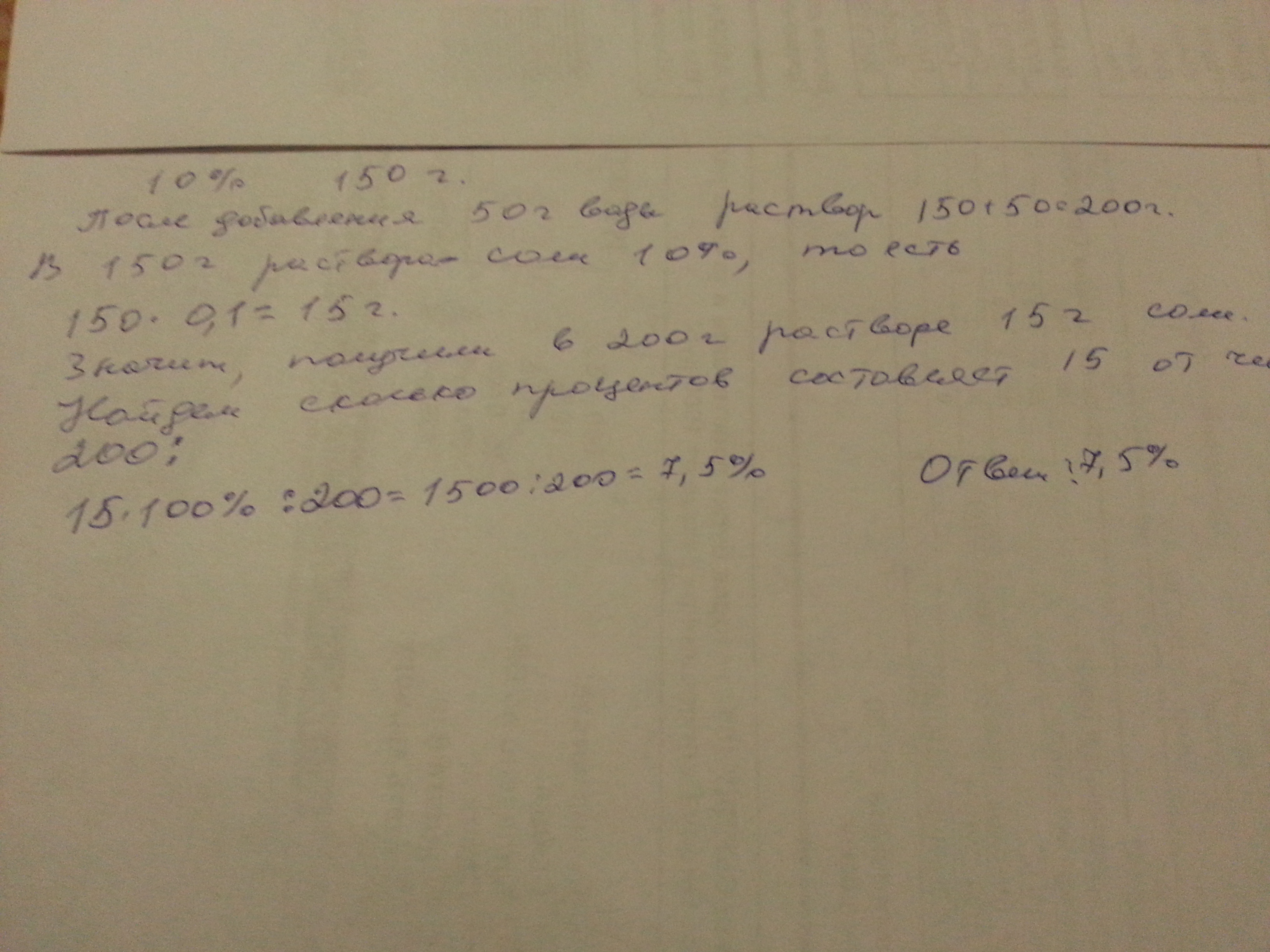 3. К 150 г 10%- ного раствора добавили 50 г воды. Найти массовую долю соли в растворе после разбавления.