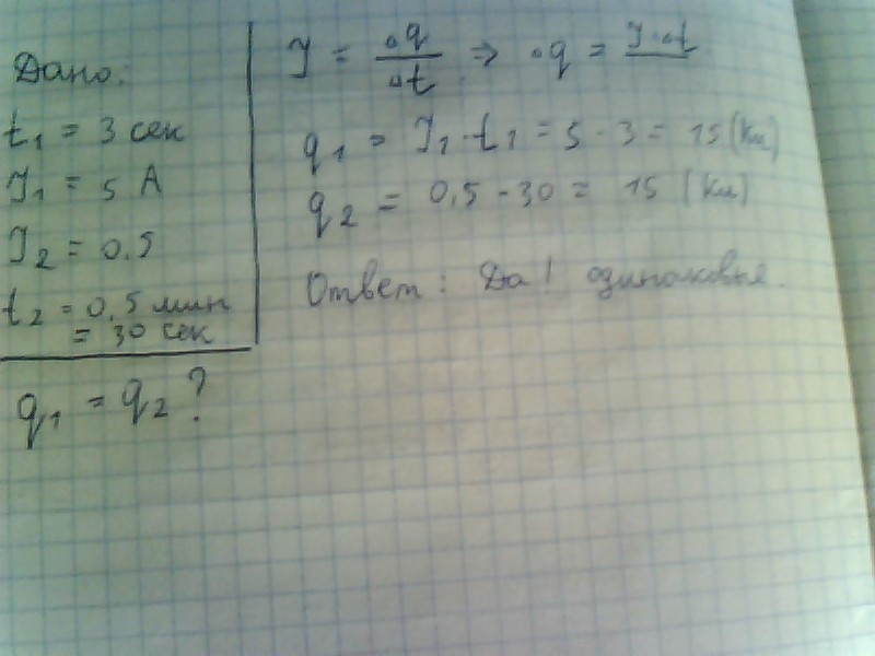 одинаковые ли электрические заряды пройдут через поперечное сечение проводника за 3 с при силе тока 5А и за 0,5 минуты при силе тока 0,5А