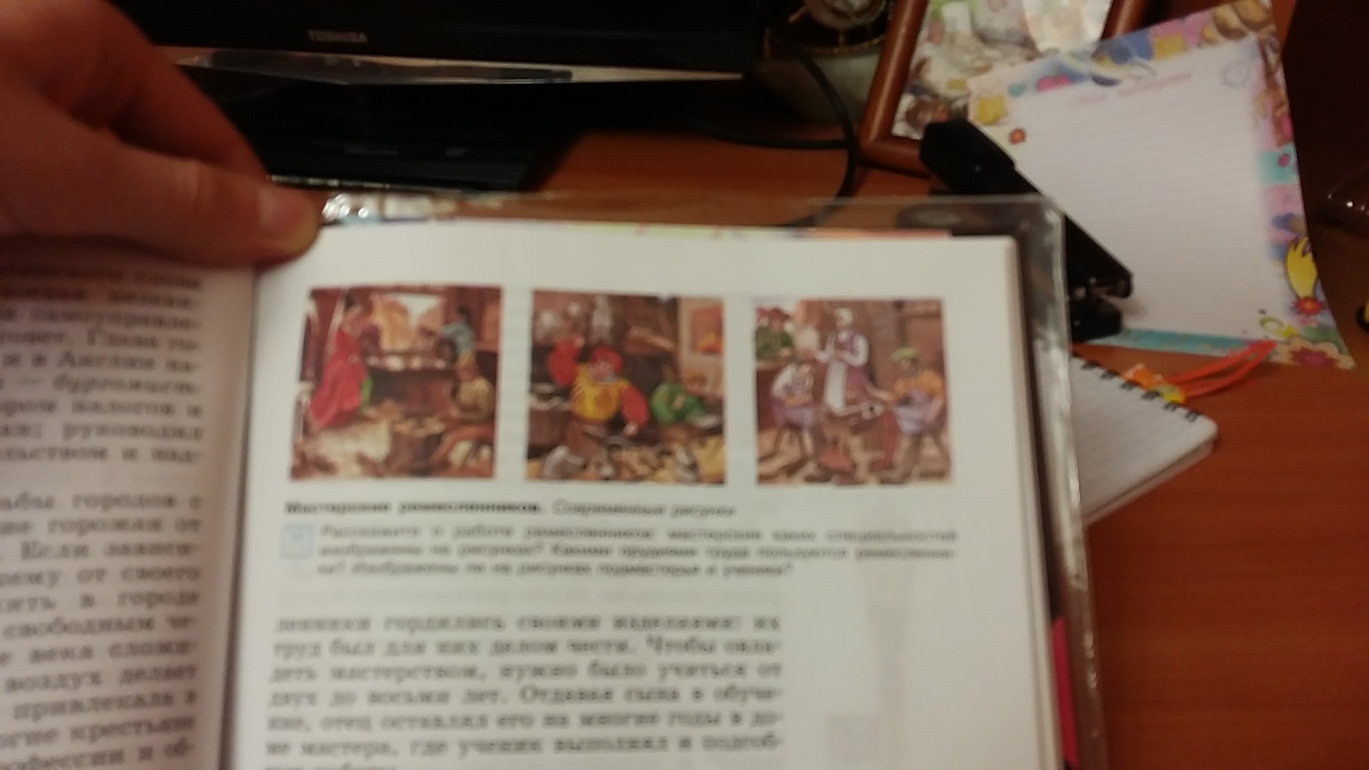Расскажите о работе ремесленников: мастерские каких специальностей изображены на рисунках?Какими орудиями труда пользуються ремесленники? Изображены ли на рисунках подмастерья и ученики?