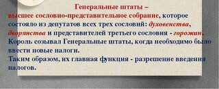 Появились в 1302 в Париже. Были созданы с целью обсуждения важнейших государственных вопросов. В Генеральные штаты входили 3 сословия - духовенство, дворянство и горожане(ремесленники, крестьяне, купцы).