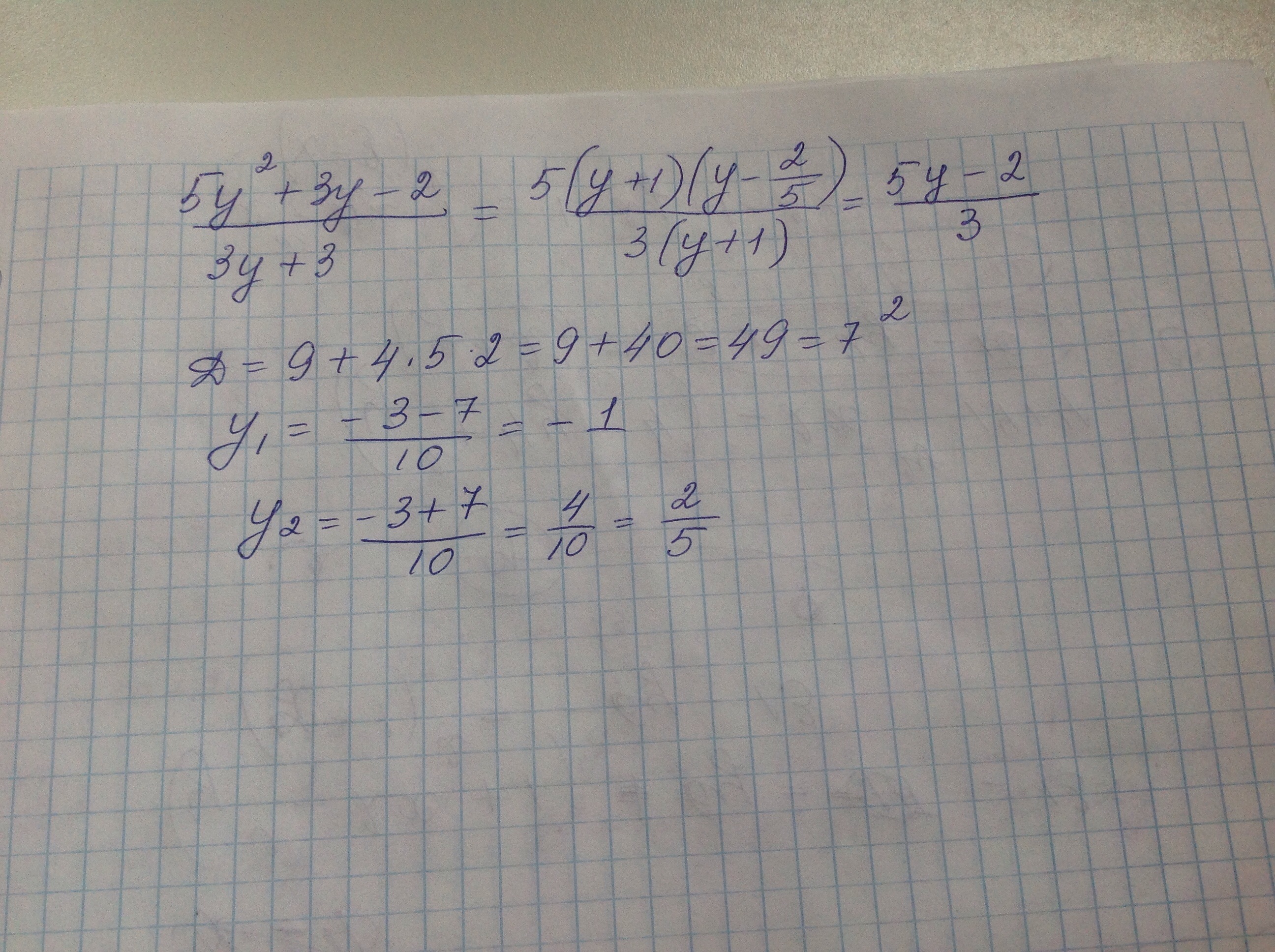 5у²+3у-2/3у+3=5у²+5у-2у-2/3(у+1)=5y(y+1)-2(y+1)/3(у+1)=(y+1)(5y-2)/3(у+1)=(5y-2)/3