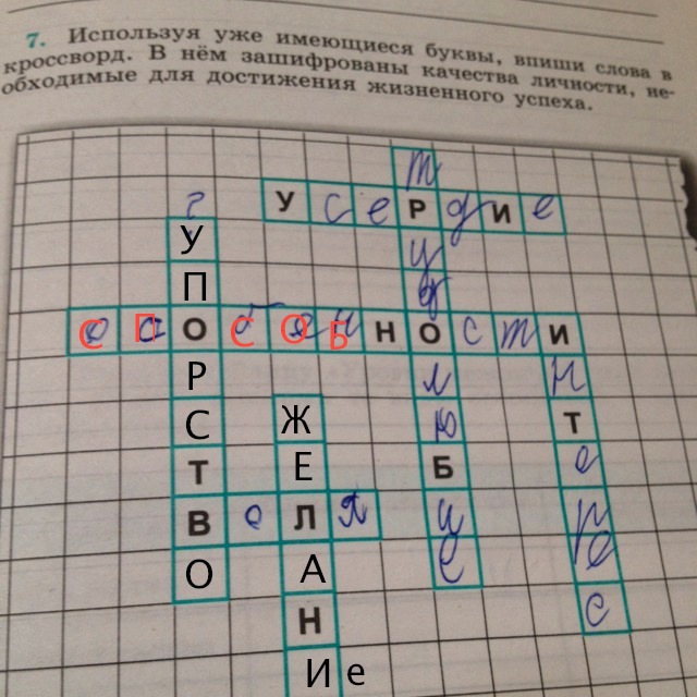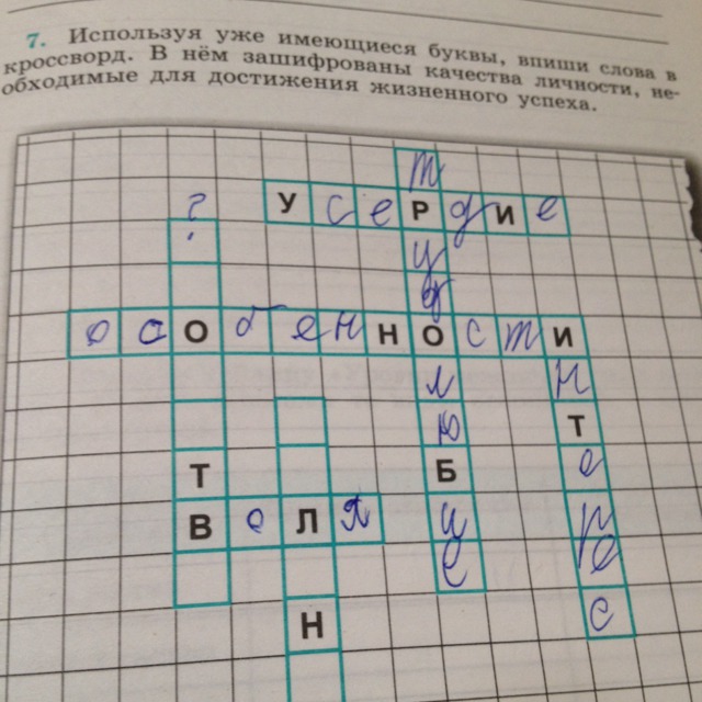 Используя уже имеющееся буквы, впиши слова в кроссворд. В нём зашифрованы качества личности, необходимые для достижения жизненного успеха.