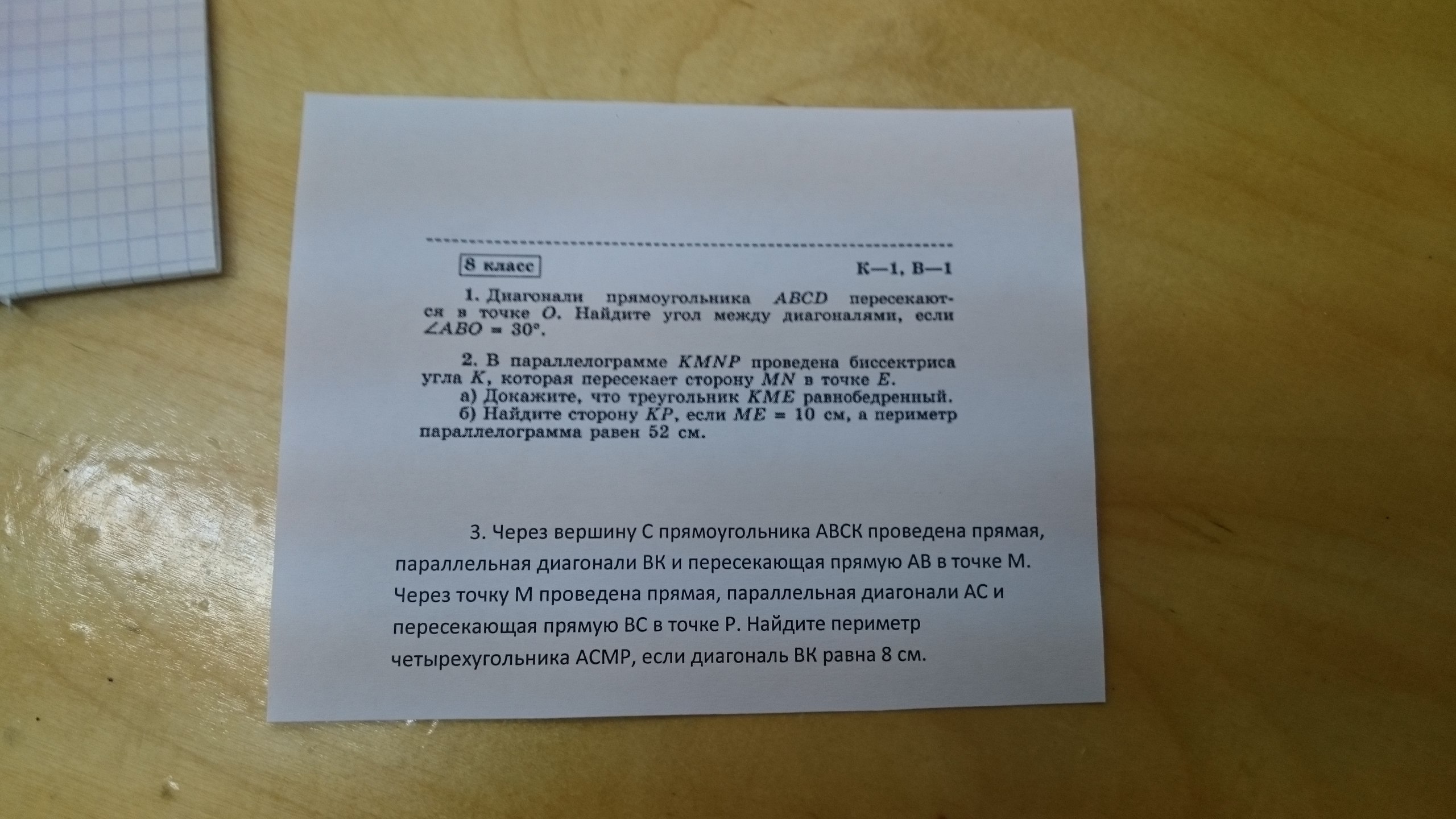 1. Диагонали в прямоугольнике делятся пополам. Значит BO=AO и тр. ABO равнобедренный. Угол ABO= углу BAO = 30гр. Сумма углов в треугольнике =180гр. Угол АОВ = 180-60=120гр. Угол ВОС= 180-120=60гр.
