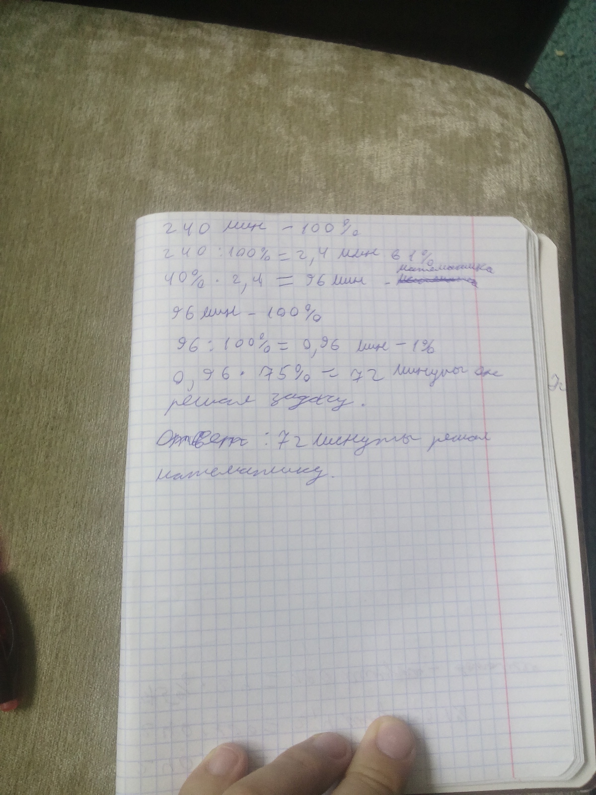 петя затратил на выполнение домашнего задания 240 мин. 40 процентов всего времени он выполнял математику, 75 процентов времени, затраченного на математику, он решал задачу.Сколько времени Петя решал задачу?