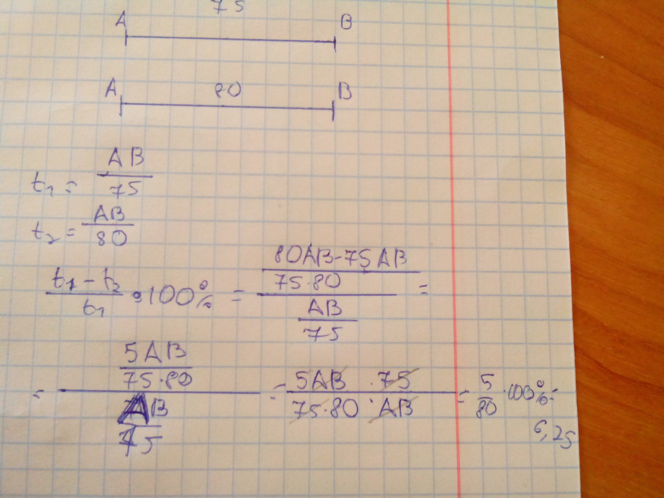 Скорость авто увеличилась с 75 до 80 км/ч. На сколько % уменьшилось время, затраченное на один и тот же путь? Помогите пожалуйста!