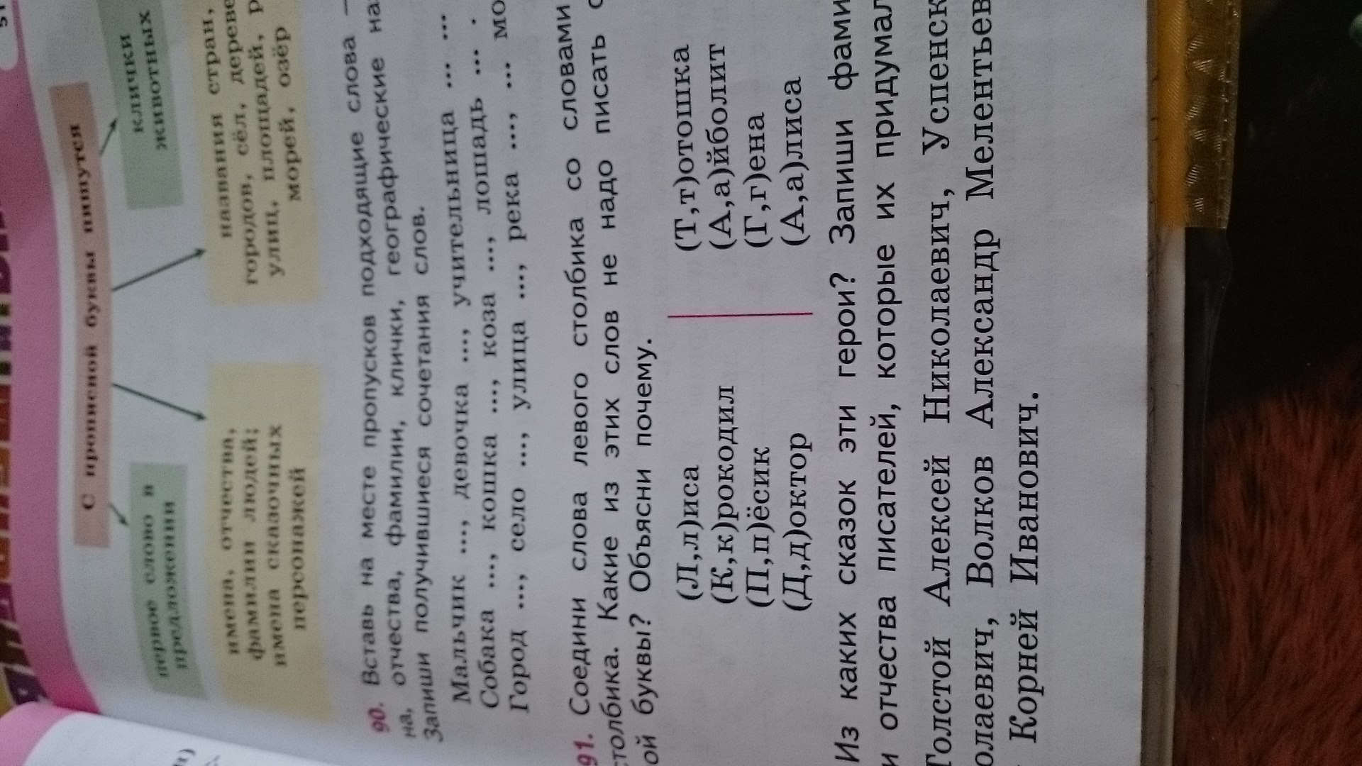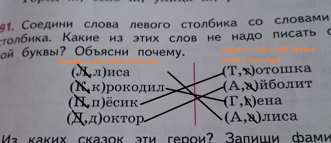 русский язык упражнение 91 соедини слова левого столбика со словами правого столбика какие из этих слов не надо писать с прописной буквы Объясни почему лиса крокодил велосипед доктор