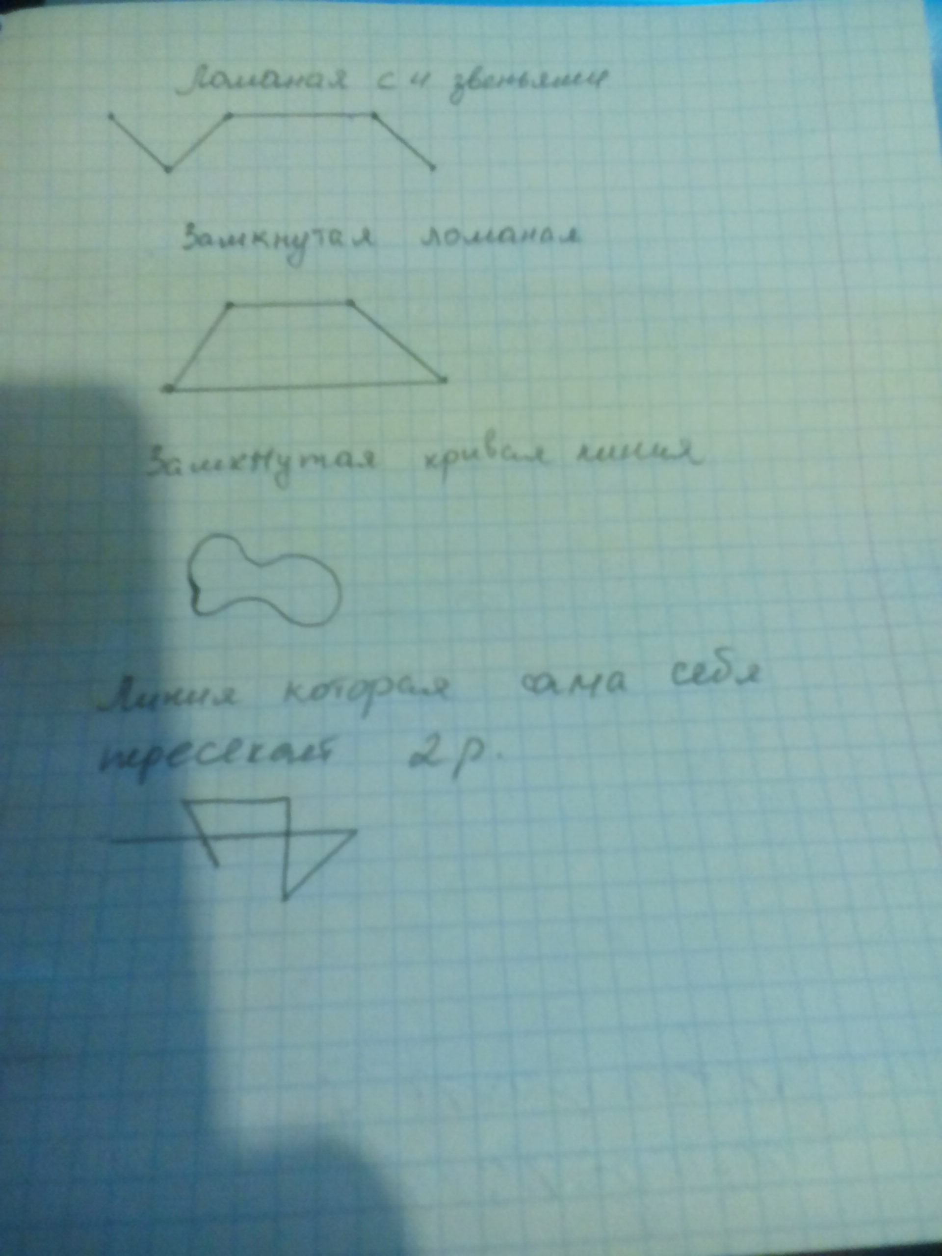 нарисуй в тетради ломаную с четырьмя звеньями; б) замкнутую ломануб; в) замкнутую кривую линию; г) линию, которая сама себя пересекает два раза