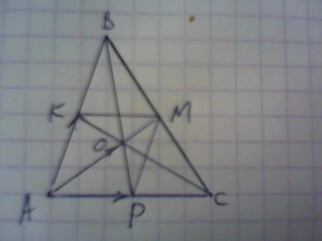 ↑АО = 2/3 ↑АМ; ↑АК+↑АР = ↑АМ; ↑АК = 0,5↑АВ; ↑АР = 0,5↑АС;