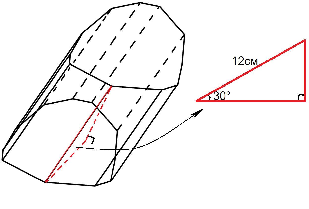 Получили прямоугольный треугольник (перпендикуляр к плоскости основания будет перпендикулярен люб(ой/ому) прямой/отрезку, лежащ(ей/ему) в плоскости этого основания) с катетом, являющимся высотой призмы, и острым углом в 30° (т.к. это и есть угол между боковым ребром и его проекции на основание), лежащим напротив этого катета. Гипотенузой будет боковое ребром. Катет лежащий напротив угла в 30°, в прямоугольном треугольнике, равен половине гипотенузы, то есть высота наклонной призмы равна 12см:2 = 6см.