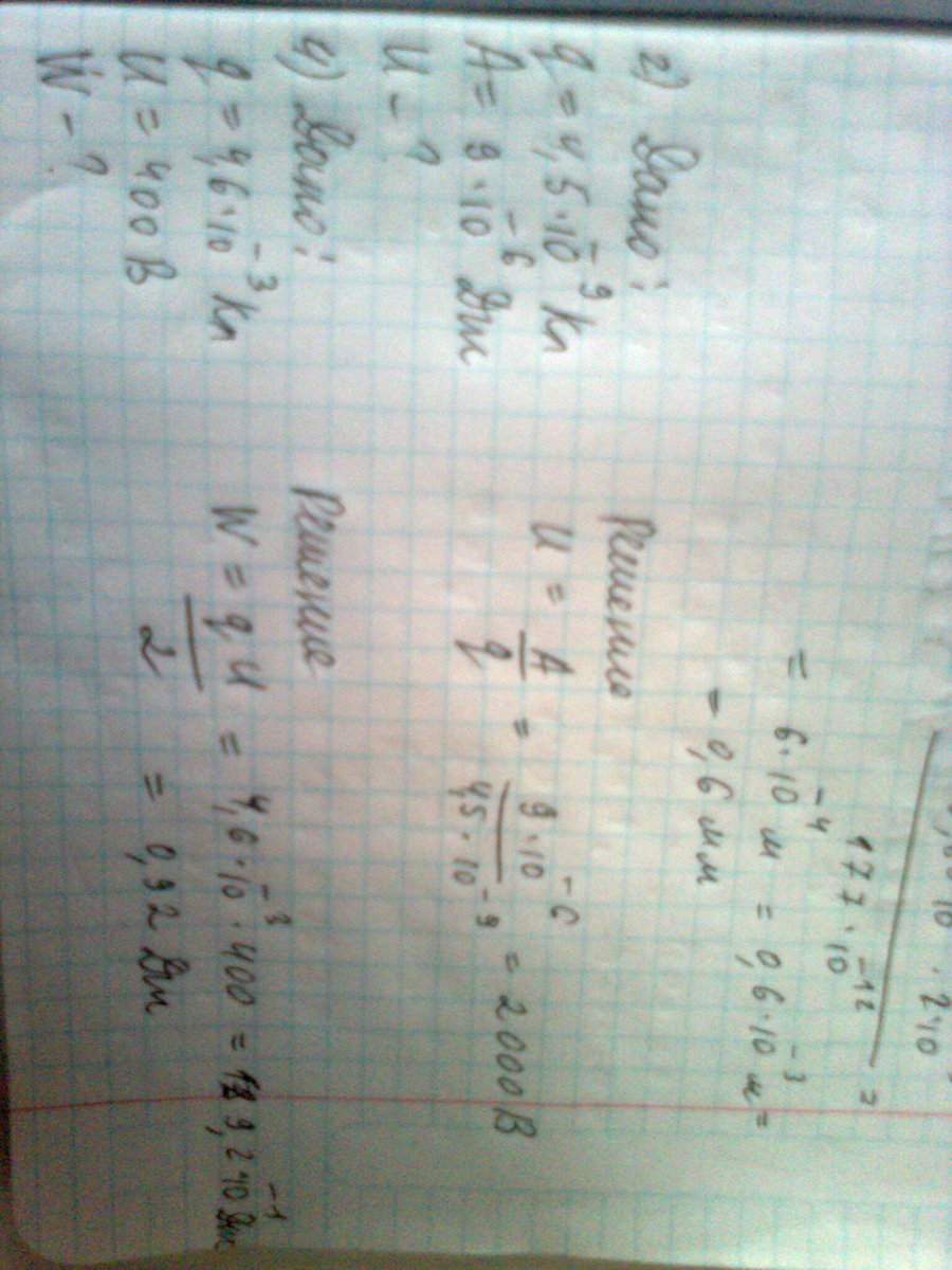 2) определить разность потенциалов между двумя точками электрического поля, есл пи перемещении заряда 4.5нКл,между этими точками поле совершает работу 9мкДж.