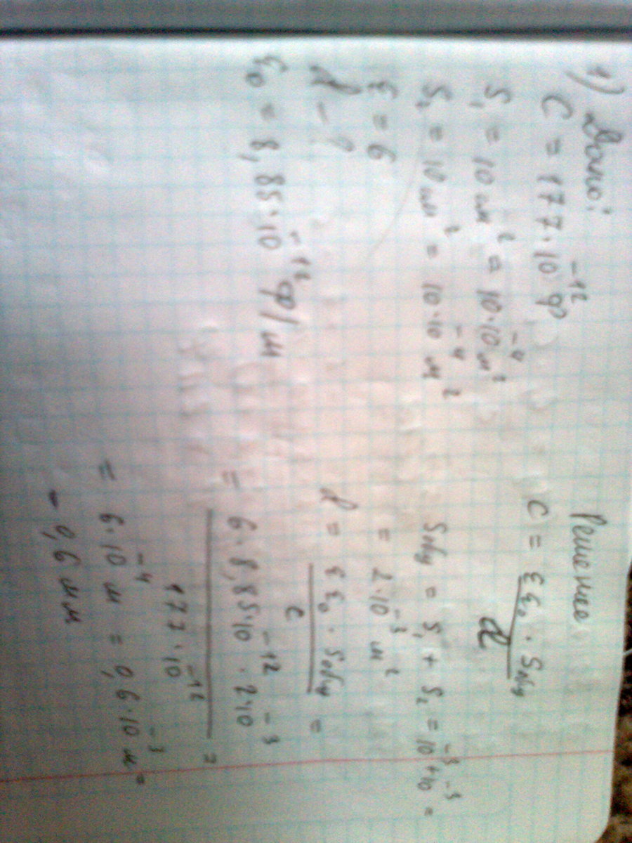 1)Какова толщина слюдяного диэлектрика в плоском конденсаторе емкостью 177пФ имеющим 2 пластинка по 10 см^2 каждая