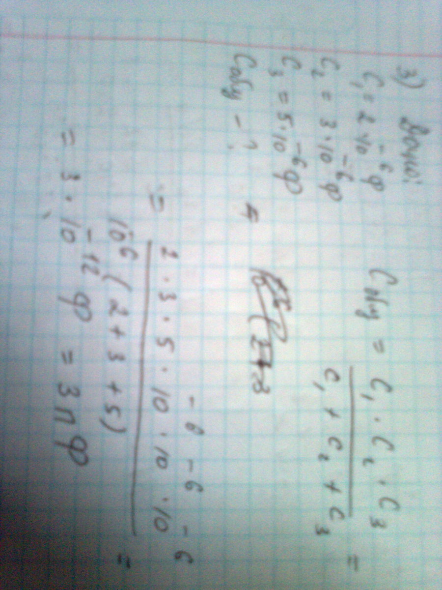 3)Три конденсатора электроемкостью 2мкФ, 3мкФ, и 5мкФ. Соеденины по схеме. изображенный на рисунке. Вычислите электроемкость батарей конденцаторов.