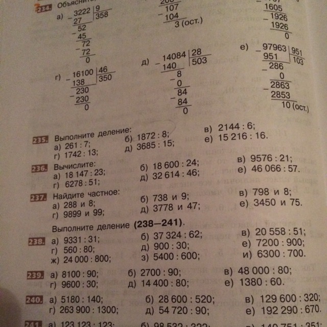 №237-а)288:8=36; б)738:9=82; в)798:8=99(ост 6); г)9899:99=99(ост 98); д)3778:47=80(ост 18); е)3450:75=46