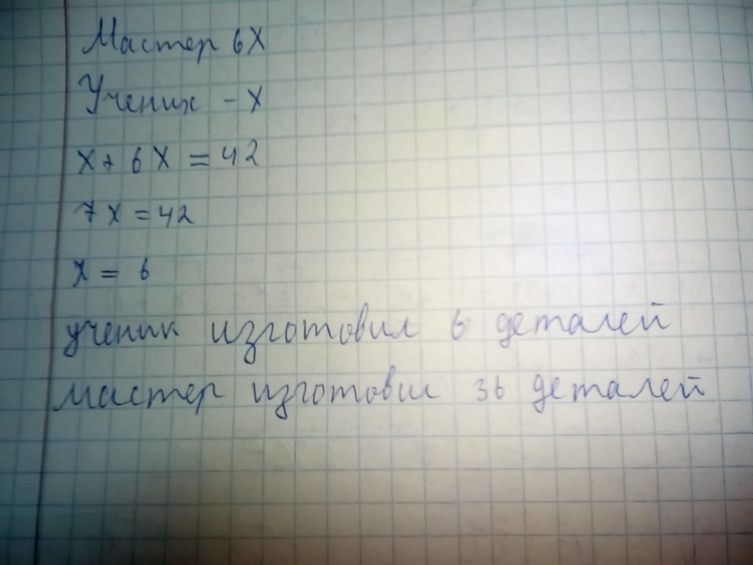 Мастер изготовил в 6 раз больше деталей, чем его ученик. Сколько деталей изготовил каждый из них, если если вместе они изготовили 42 детали?