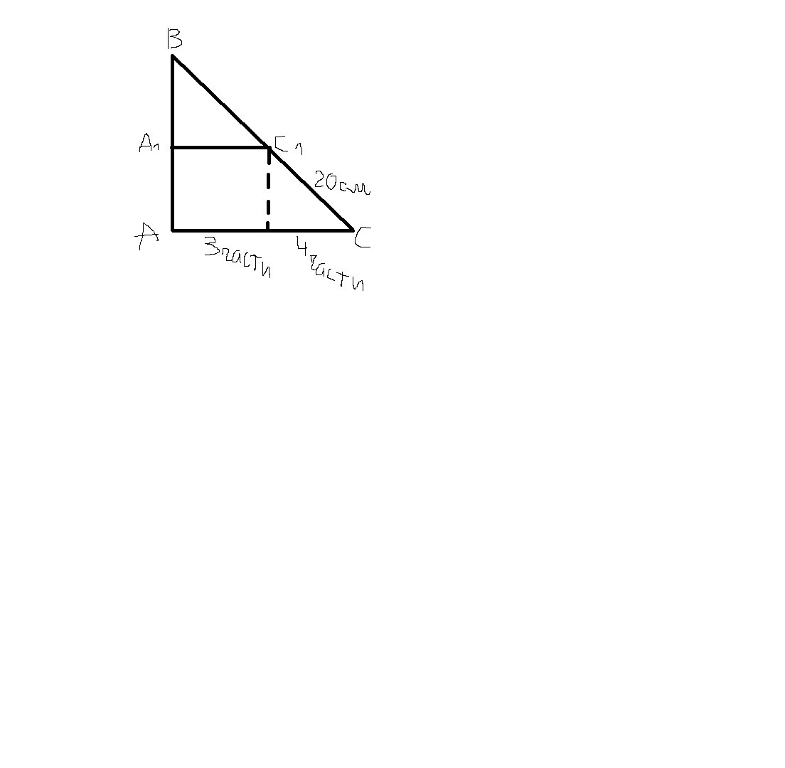 допустим линия с точки С1 которая опускается на сторону АС заканчивается точка L, тогда треугольники С1 L C и А1 В С1 равносторонние, если С1 С 20 см, то и СL и С1С 20 см. Если соотношения 3/7 то на сторону А1С1 приходится 3 части, а на сторону LC 4 части. 20/4 = 5 см(одна часть). Значит у треугольника АВС стороны 15 см.
