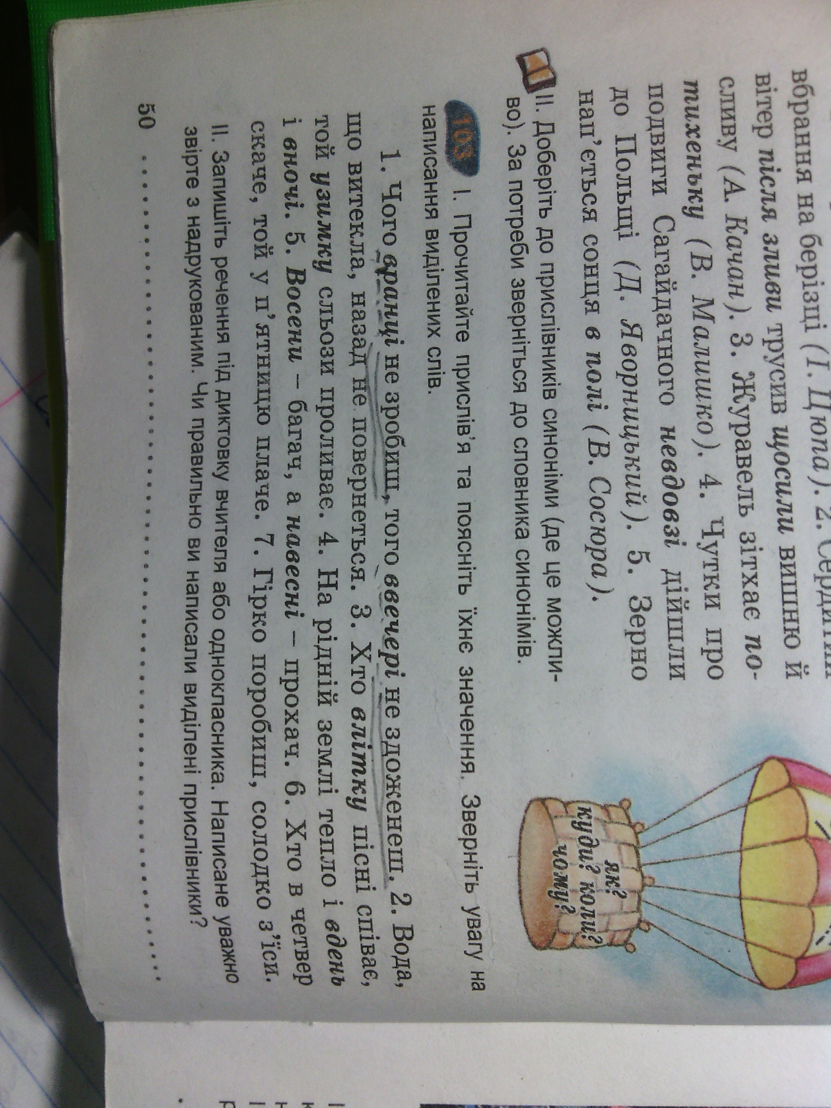 Підкресліть обставини як члени речення. Надпишіть над ними питання, на які вони відповідають. Які з обставин протилежні за значенням. Спасибі. Вправа 103