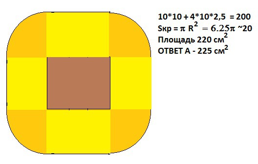 Круг радиуса 2,5 перемещается по столу Так что центр обходит контур квадрата со стороной 10 сантиметров.Найдите площадь части стола, образованный следом Круга. Выберите из приведенных в ответах наиболее точное значение.