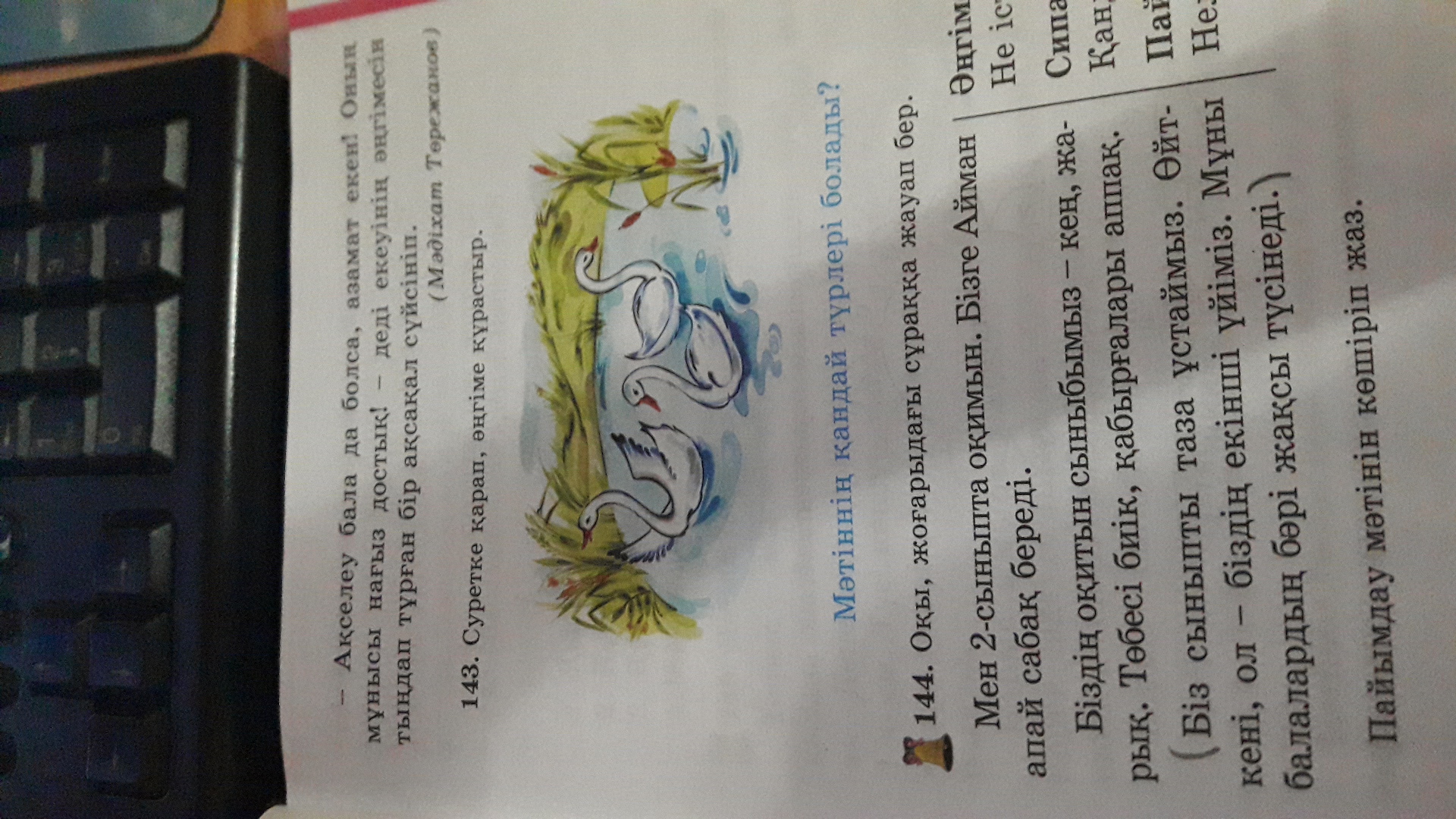 Бүгінгі күн ашық, күн күлім тұр. Əдемі аққулар кішкентай өзенде шомылып, рахаттанып отыр.Менің де осы аққулардың орнында болсам деп армандаймын. Айналаның бəрі жасыл, күн ерекше жылы болып тұр.