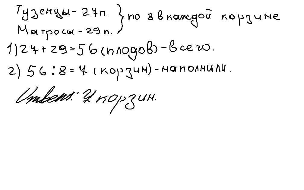 подскажите пожалуйста задачу туземцы сняли с хлебного дерева 27 плодов,а оставшиеся 29 плодов сняли матросы все плоды разложили в несколько корзин по 8 плодов в каждой корзине сколько корзин наполнили?