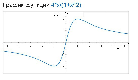 2 f(-x)=4(-x)/(1+(-x)²)=-4x/(1+x²) функция нечетная, график симметричен относительно начала координат