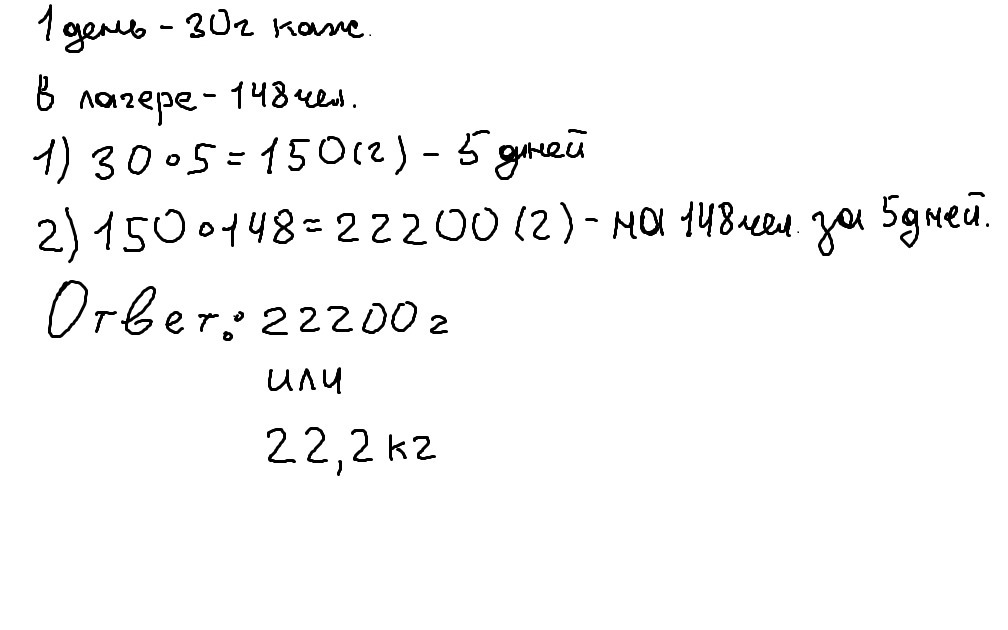 30 г*148=4440 г=4,44 кг (на 1 день на весь лагерь)
