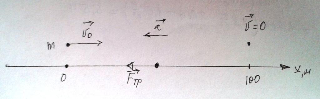 Тело массой 50 кг получив начальную скорость 10 м/с, остановилось пройдя по горизонтальному полу 100м. На силу трения и время до остановки.