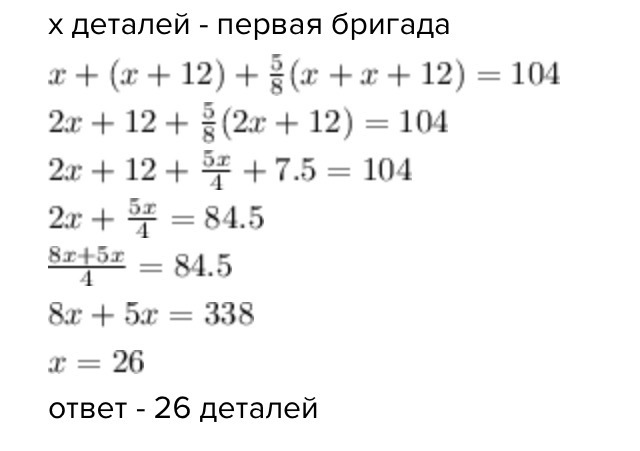 Ребят срочно плизззз три бригады изготовили за смену 104 детали.первая изготовила на 12меньше чем вторая а третья 5/8 того кол.-ва деталей,которое изготовили первая и вторая бригада вместе.сколько деталей изготовила каждая бригада?