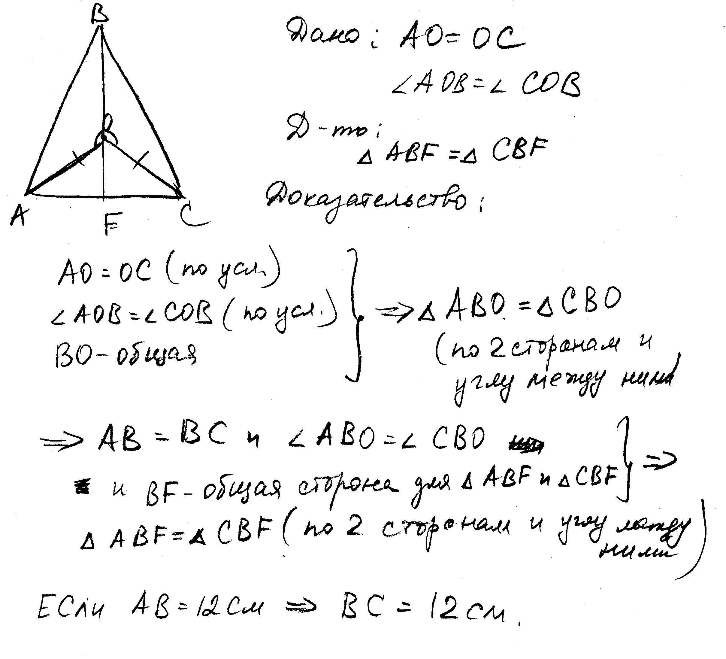 Они равны по 2-ум сторонам и углу, отсюда следует, что BC=AB=12