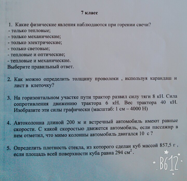 1. Тепловые и оптические. 2. Обычный лист в клетку расчерчен на квадраты со стороной 5 мм. Можно, прикладывая проволоку к бумаге, отметить её толщину карандашом. Таким образом можно определить, сколько таких отметок поместится на стороне одной клеточки. А потом разделить 5 мм на число отметок. Результат получится точнее, если сделать отметки на 2 клеточках.3. 4. Относительная скорость автомобиля и автоколонны 200м/10с=20м/сЕсли скорости автоколонны и автомобиля относительно земли одинаковы, то скорость автомобиля в 2 раза меньше 20:2=10м/с5. У куба 6 одинаковых граней. Площадь одной грани 294:6=49 см². Ребро грани √49=7см. Объём куба 7³=343см³. Плотность стекла 857,5г/343см³=2,5г/см³