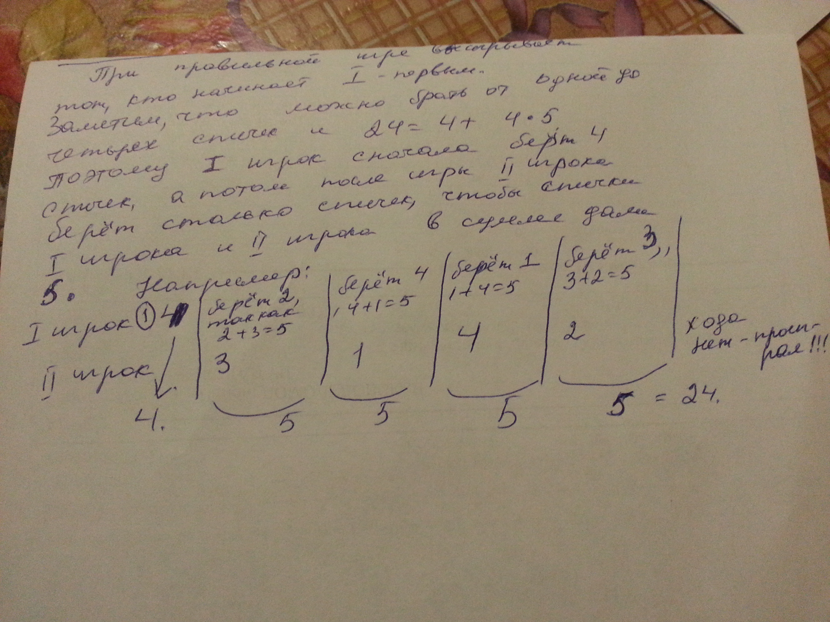 На столе лежит 24 спички. Игроки по очереди могут взять от одного до четырех спичек. Кто не может сделать ход (спичек не осталось) проигрывает. Кто выигрывает при правильной игре - тот, кто начинает игру, или его соперник? Как он должен играть, чтобы выиграть? Ответ обоснуйте. Подайте детальное объяснение.