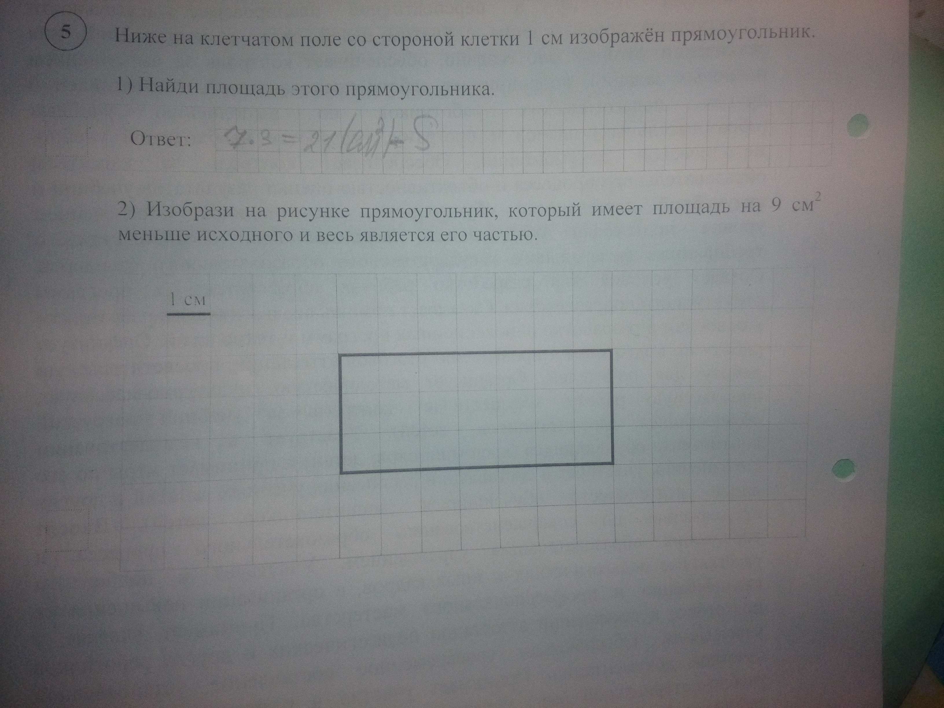 Изобразить на рисунке прямоугольник, который имеет площадь на 9 см квадратных меньше исходного и весь является его частью.