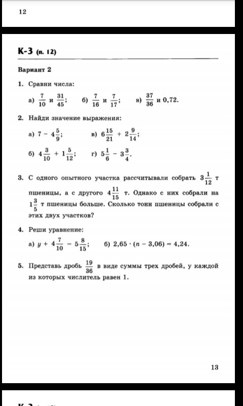 3.;3frac12+4frac{11}{15}=frac72+frac{71}{15}=frac{105+142}{30}=frac{247}{30}\frac{247}{30}+1frac35=frac{247}{30}+frac85=frac{247+48}{30}=frac{295}{30}=9frac{25}{30}=9frac56\\4.;a);y+4frac7{10}=5frac8{15}\y=5frac8{15}-4frac7{10}=frac{83}{15}-frac{47}{10}=frac{166-141}{30}=frac{25}{30}=frac56\b);2,65cdot(n-3,06)=4,24\n-3,06=1,6\n=1,6+3,06=4,66\\5.;frac{19}{36}=frac14+frac16+frac19