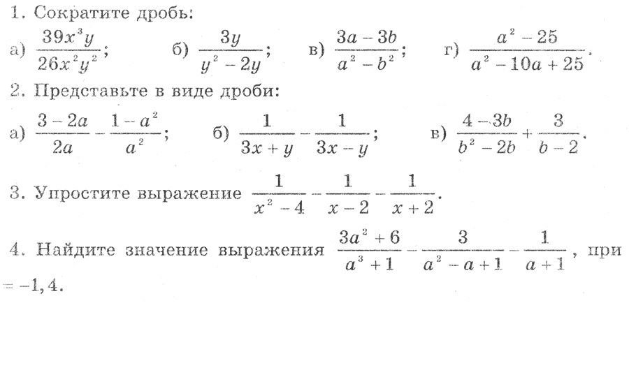 3.;frac1{x^2-4}-frac1{x-2}-frac1{x+2}=frac1{(x-2)(x+2)}-frac1{x-2}-frac1{x+2}=\=frac{1-(x+2)-(x-2)}{(x-2)(x+2)}=frac{1-x-2-x+2}{(x-2)(x+2)}=frac{1-2x}{(x-2)(x+2)}=frac{1-2x}{x^2-4}\\4.;frac{3a^2+6}{a^3+1}-frac3{a^2-a+1}-frac1{a+1}=frac{3a^2+6}{(a^2-a+1)(a+1)}-frac3{a^2-a+1}-frac1{a+1}=\=frac{3a^2+6-3(a+1)-(a^2-a+1)}{(a^2-a+1)(a+1)}=frac{3a^2+6-3a-3-a^2+a-1}{(a^2-a+1)(a+1)}=\=frac{2a^2-2a+2}{a^3+1}=frac{2cdot(-1,4)^2-2cdot(-1,4)+2}{(-1,4)^3+1}=frac{3,92+2,8+2}{-2,744+1}=