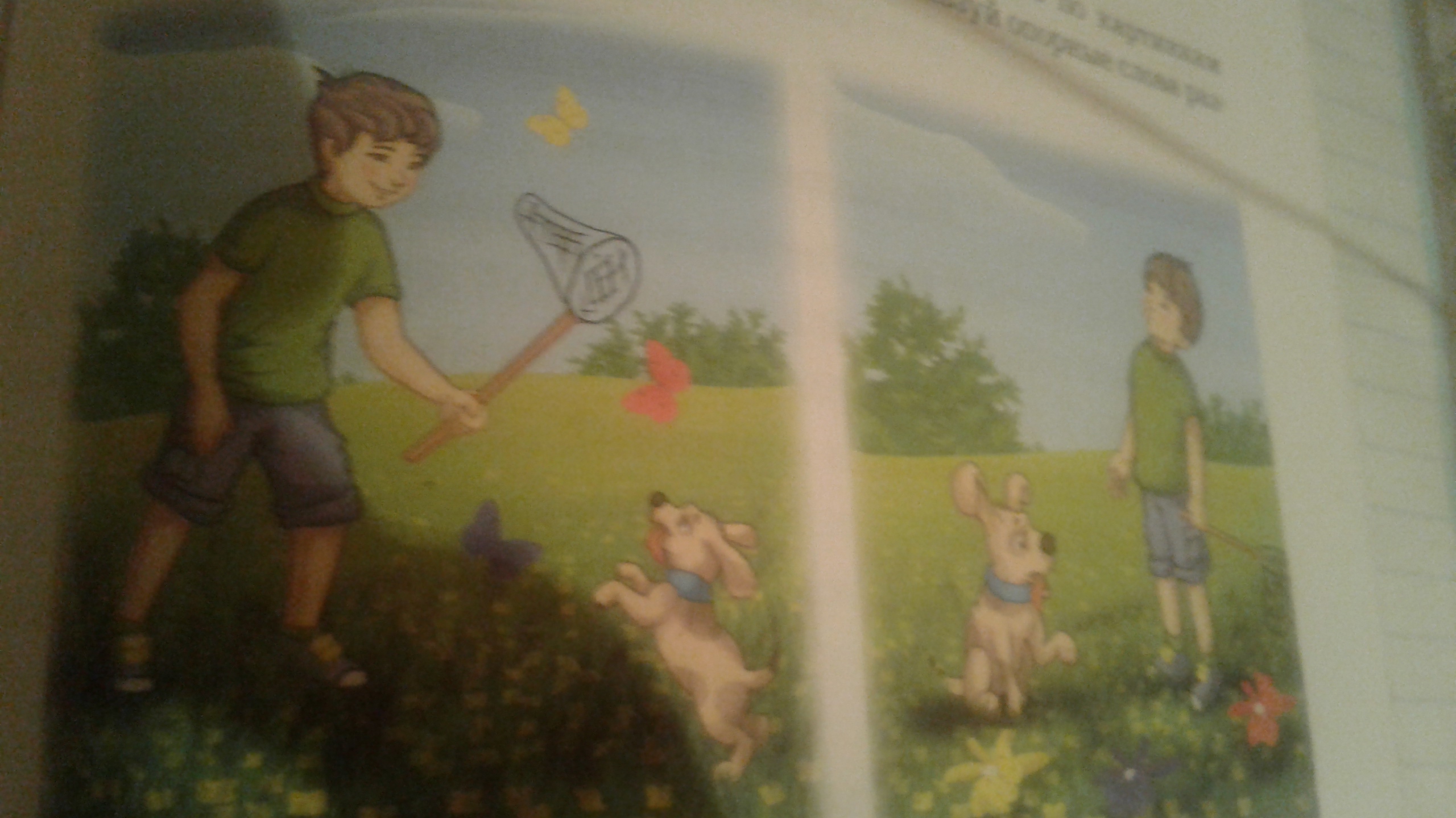 мальчик хотел поймать бабочку но увидел собачку и решил подружиться с ней. а про бабочку он и забыл. а собаку взял домой.