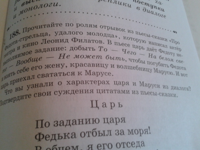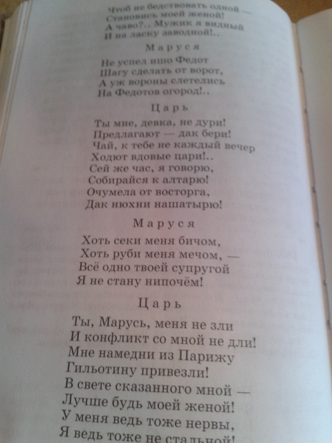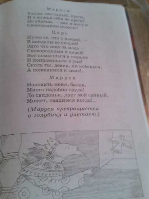 Уарь едет сватать Марусю. Объясняет вначале свое появление заботой о Марусе." Чтоб не маяться одной становись моей женой. Понимает, что он стар и некрасив, добавляет А ЧАВО? Мужик я видный ( своим высоким положением) и характер заводной, как у молодого." Маруся предана Федоту, говорит, что "не успел Федот шагу сделать за порог" прошло совсем мало времени, как ушел ее муж. Используя фразеологический оборот " вороны слетались" ,она характеризует царя. Царь показан малограмотным (обыгрывается юмористически) в его речи много слов разговорных:"Не дури, чай, ходють, очумела." Маруся настойчива. Анафора "Хоть секи,хоть руби".. звучит как клятва.Поняв, что добром Марусю уговорить нельзя, Царь прибегает к угрозе смертной казни(упоминает о гильотине) Но Маруся остается преданной своему мужу. Царь немного отступает, снова звучит угроза , но теперь Царь назначает новую дату венчанья (к зиме), он почувствовал,понял стойкий характер Маруси. Отрывок заканчивается ремаркой "Маруся улетает". Это отражение ее характера. Даже Царь не может сказками и ласками, и угрозами зхаставить пойти против себя.