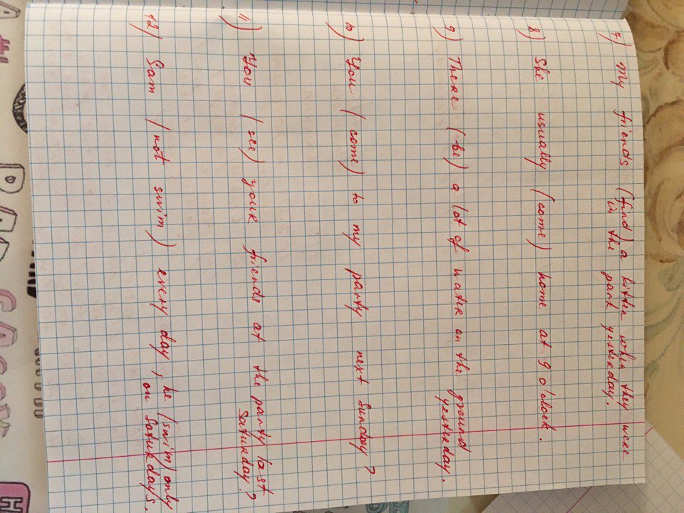 Found; comes; were; will you come; did you see;does not swim, swims .