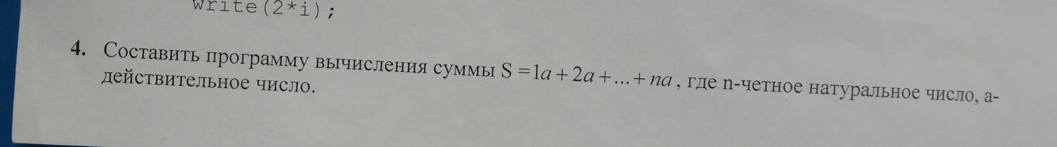 for i:=1 to n do s:=s+i*a; Сумматор s необходимо обнулить перед началом цикла, все переменные объявить и записать цикл выше.