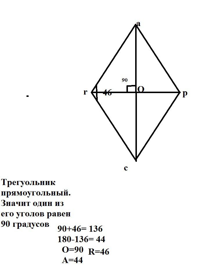 В ромбе ARCP угол R=46 градусов. Диагонали пересекаются в точке О.