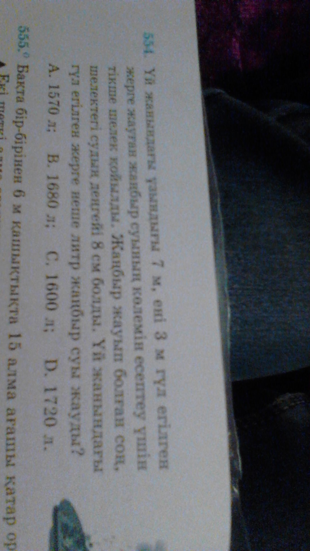 ұзындығы a=7м=700см, енi b=3м=300см, биiктiгi c=8см. көлемі V=abc=700*300*8см³=1680000см³=1680л