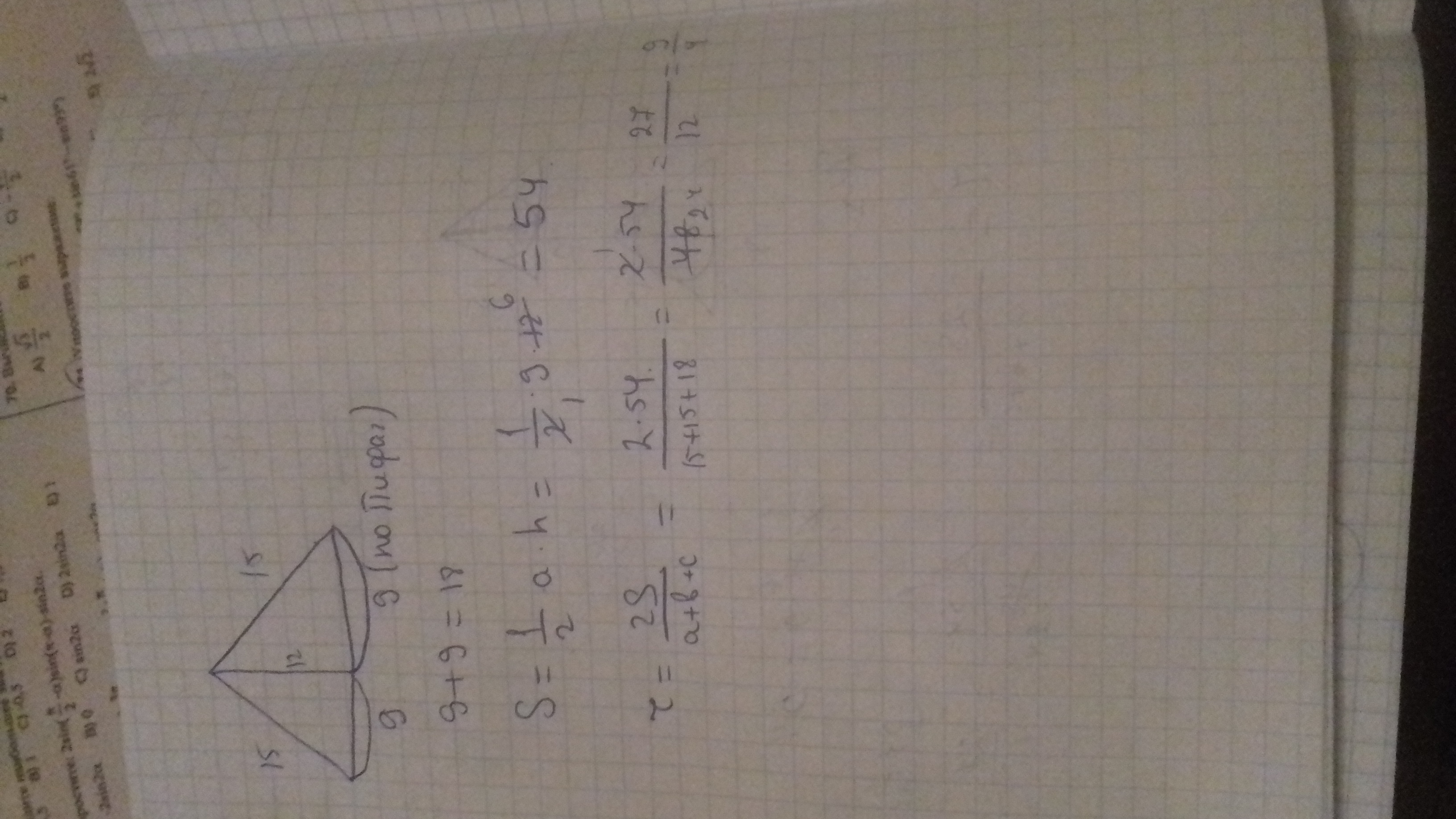 помогите плес с задачкай)):В ровнобедренном треугольнике боковые стороны равны 15 см, а высота, опущенная на основание, равна 12 см. Найдите радиус вписанной в треугольник окружности.
