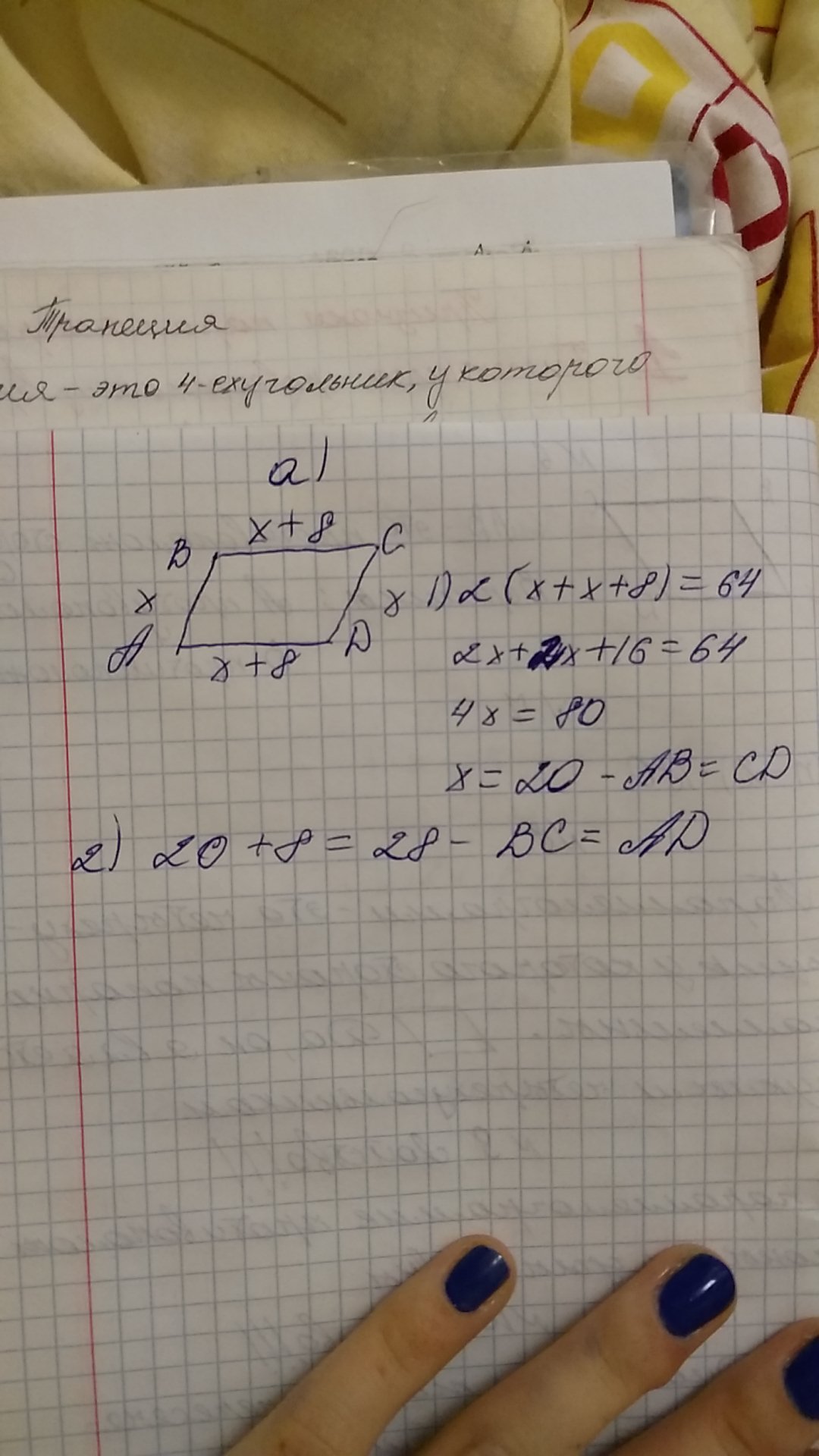 а) стороны, если ВС на 8 см больше стороны АВ, а периметр равен 64 см;