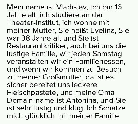 Мое имя Влдислав, мне 16 лет, я учусь в театральном институте. Я живу со своей мамой, её зову Эвелина, ей было 38 лет и она ресторанный критик, мы тоже забавная семья, каждое воскресенье готовим вместе еду и когда идем в гости к бабушке, там едим вкусные спагетти с мясом, мою бабушку зовут Антонина и она очень смешная и умная. Я удачен со своей семьёй!