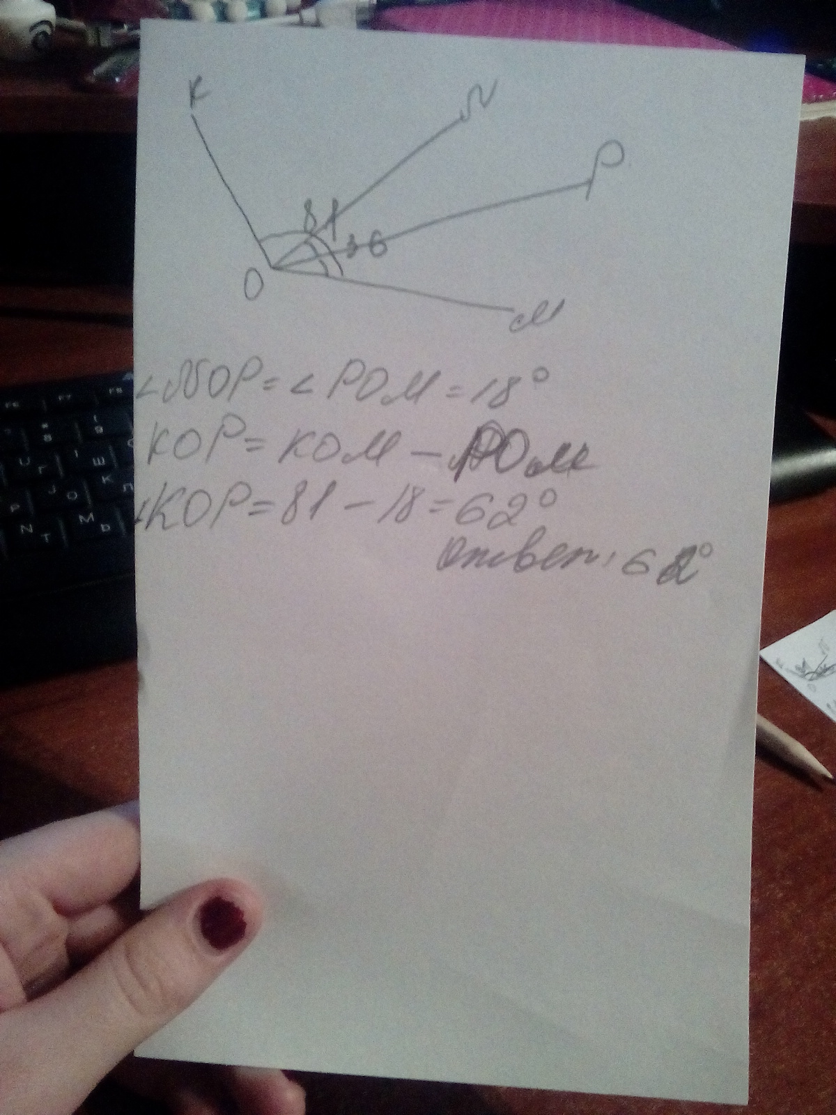 Дано: ON и OP, угол КОМ=81, угол МОN=36, ОР - биссектриса угла MON.