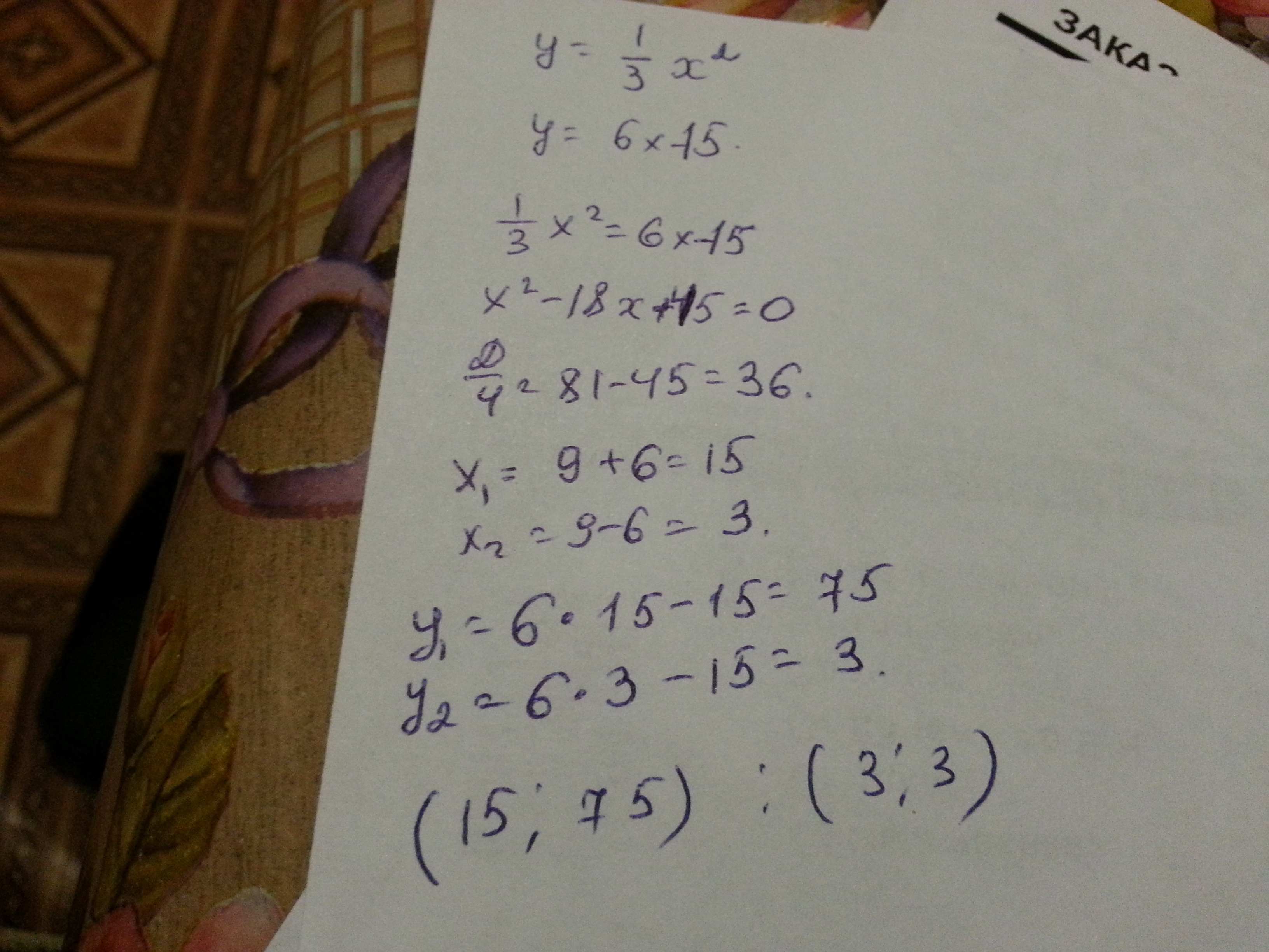 Не выполняя построение, определите, пересекаются ли парабола y=1/3x^2 и прямая y=6x-15. если точки пересечения существует, то найдите их координаты