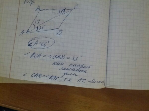 Найдите величину острого угла параллелограмма АВСД, если биссектриса угла А образует со стороной ВС угол = 33 градуса?